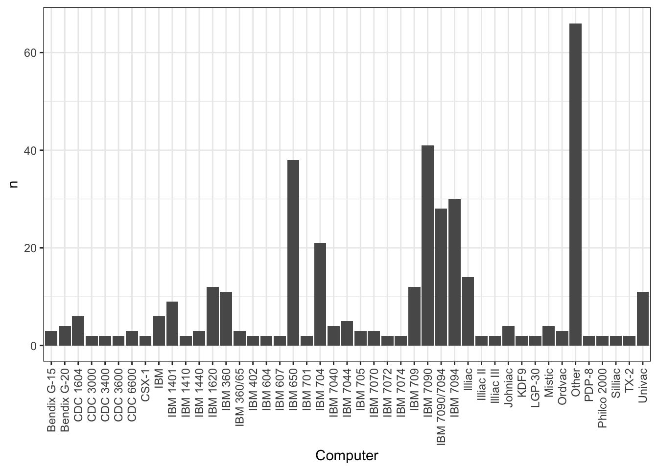 The words “clerk” or “clerical” (including plurals and other derivations) appear in 79 articles in the corpus. Close reading of these instances indicates that there was a fluid boundary between metaphorical and literal clerks in the early days of the Computational Human Sciences. Sometimes, a computer would be gradually programmed by a research group to resemble their human clerks, until the human clerks no longer found employment in the research.