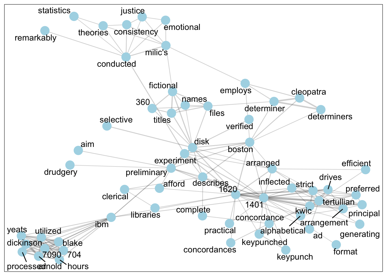 As can be seen, the discourse of “experiment” differs markedly in the Psychology and Literary Studies articles. In the Literary Studies articles, the experiment is the use of computers. Close associates of the word “experiment” include the names of popular contemporary machines (e.g. the IBM 1401 or 1620), and words describing the concrete process of using the computer (hours, processed, verified, disk, arranged, etc.). The discourse in Psychology is nothing like this. In the 1950s and 1960s, Psychology was already established as an “experimental” discipline, especially in the United States, where most of our corpus originates. Here the computer is talked about in a more abstract way, as an existing experimental paradigm is computerized, perhaps with a corresponding reduction of effort.