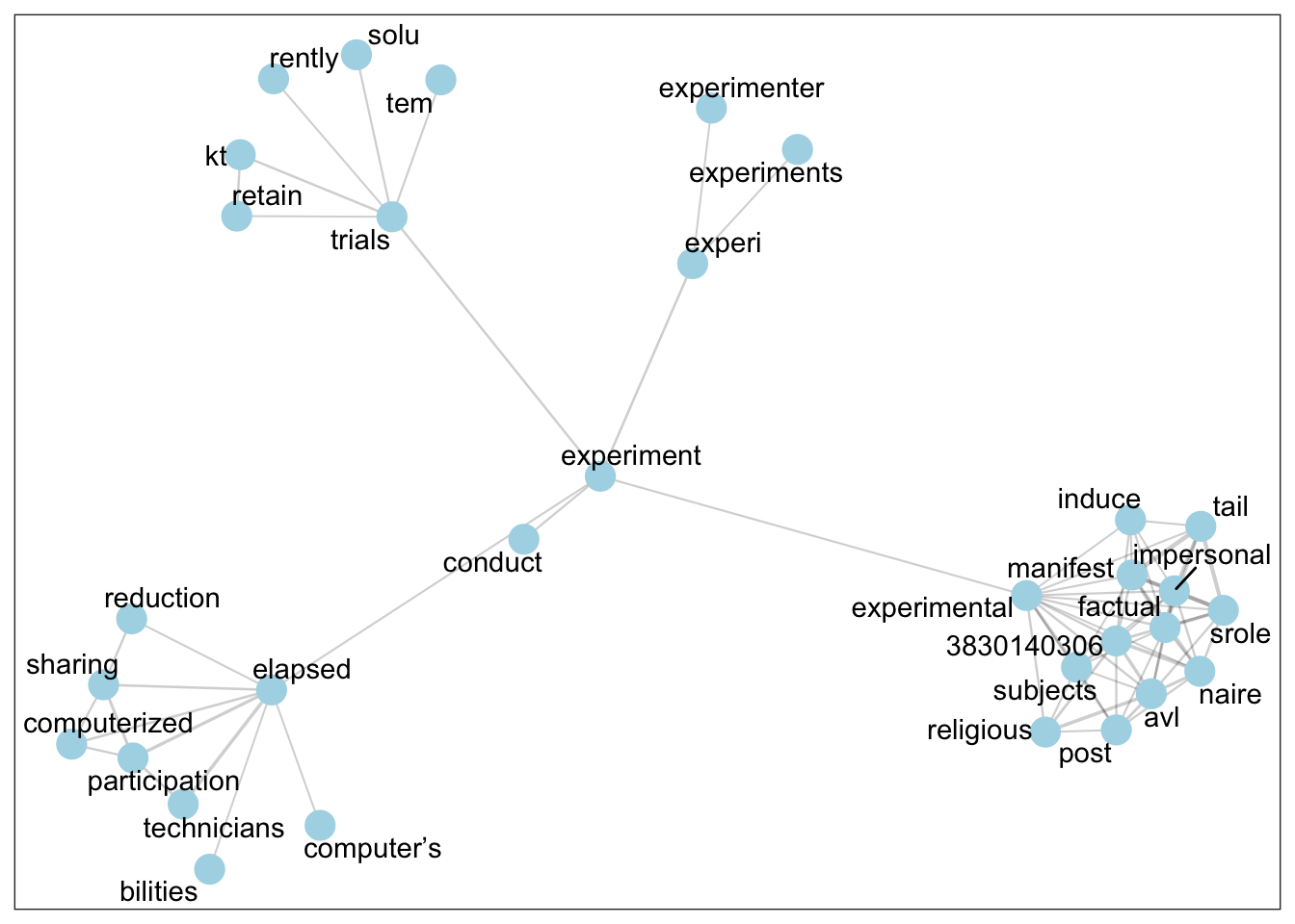 To understand the range of methods (RQ1) and their justification (RQ2), we investigate keywords in the corpus using various text-analytic techniques. In this abstract, we show just one of these techniques: lexical network analysis. Figure 2 and Figure 3 show lexical networks for the word “experiment” in the Psychology (n=71) and Literary Studies (n=46) articles in the corpus. To produce these networks, the documents are split into 200-word chunks, pairwise correlations are computed between all the words, the data is converted into a graphical format using iGraph, edges are dropped between words if their pairwise correlation is less than 0.35, and then the neighbourhood of order 2 is shown for the target word (in this case, “experiment”). In a nutshell, the figures show the most closely associated words with the target word, along with the associated words’ most associated words.